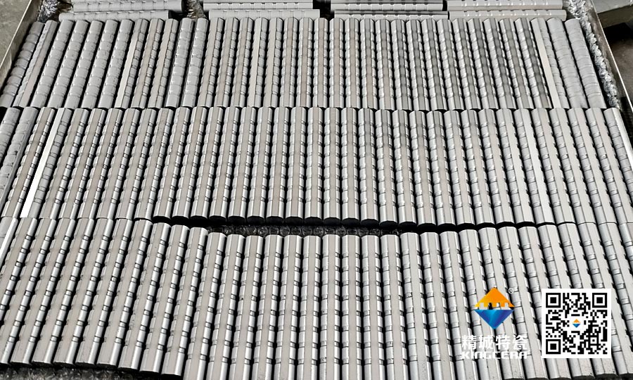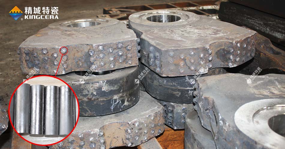 精城特瓷生產(chǎn)的碳化鈦基金屬陶瓷棒是以碳化鈦(TiC) 為硬質(zhì)相,高錳鋼及其他金屬粉末為粘結(jié)相,再適當配入相應的合金元素,用粉末冶金方法生產(chǎn)的一種硬質(zhì)合金材料,可廣泛應用于礦山,水泥、制砂等各種沖擊工況行業(yè)等,其中牌號TM52被廣泛應用在破碎機耐磨件上,采用熔融的高錳鋼液澆鑄,將合金棒鑲鑄在耐磨件的工作面,二者產(chǎn)生牢固的冶金結(jié)合,制備成復合耐磨件,有效減少了基體材料高錳鋼的磨損,維修量和更換量顯著減少,從而降低了備件費用,提高了破碎比和出料率。