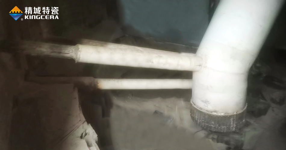 以回料管為例,生料立磨研磨的物料以礦石為主,大小不一、水分含量不同、硬度差異大、結構復雜,而且還伴隨230℃左右的高溫,磨損情況復雜。而立磨回料管經常需要輸送選粉機回落下來的礦石,棱角鋒利,加上太行山地區礦石硬度高,含鐵量較大,管道內壁承受切削磨損,回料管外壁還要承受風蝕磨損和強沖擊,同樣伴隨高溫。雙重磨損之下,回料管很容易被磨穿,針對這種復雜情況,精城現場技術支持工程師當場給出了具體解決方案,不同磨損采用不同的陶瓷工藝,在盡可能節省成本的同時為客戶解決了磨損難題。